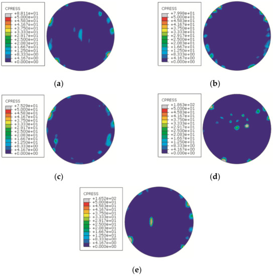 Contact pressure distribution contours of five samples. (a) Group 1; (b) Group 2; (c) Group 3; (d) Group 4; (e) Group 5.