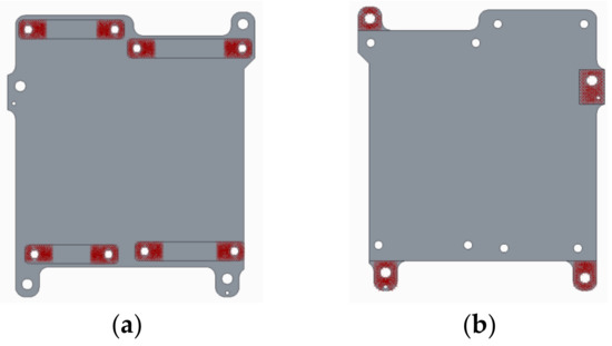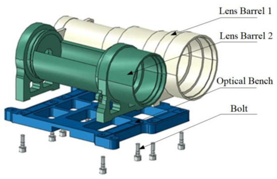 The samples used in Case 1 were for comparing the prediction effect of the two methods. However, the sample was relatively simple, and the main purpose was to verify the accuracy of the prediction method. For testing the practical application of the proposed method, a relatively complex case from an actual production process was used. The precision optical lens is a typical precision instrument, and its assembly is shown in Figure 7. The assembly consists of two lens barrels and an optical bench, connected by eight M5 bolts. The optical bench is the core part of the assembly. It is the assembly base for the two lens barrels, and also for the overall installation of the optical lens. Figure 8 shows the assembly plane of the optical holder. Figure 8a displays the assembly plane of the lens barrels and optical bench; the highlighted part is the contact part between the lens barrel and optical bench. Figure 8b displays the assembly plane between the optical bench and assembly base of the overall optical lens; the highlighted part is the contact part between the optical bench and assembly base of the overall optical lens. Therefore, the overall flatness of the four small planes in Figure 8b can affect the assembly accuracy of the precision optical lens. Due to the influence of structural deformation and processing accuracy, the assembly between the lens barrels and optical bench can inevitably lead to the warping of the optical bench assembly surface, which is related to the contact surface between the lens barrels and optical bench.