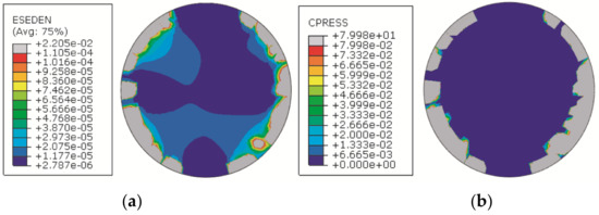 Comparison between the contact pressure and strain-energy contours. (a) Strain energy density contour; (b) contact pressure contour.