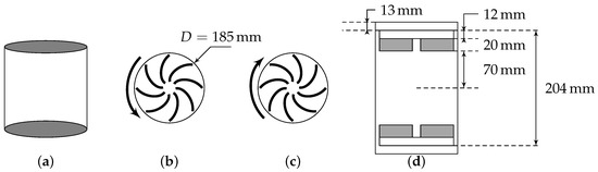 Von Kármán swirling flow generator. (a) normal view, bottom (b) and top (c) impellers rotating -both seen from the center of the cylinder, and (d) sketch with the relevant measures. A device not shown here maintains the temperature constant during the experiment. Both impellers are counter-rotating.