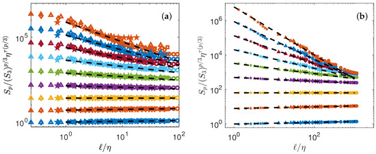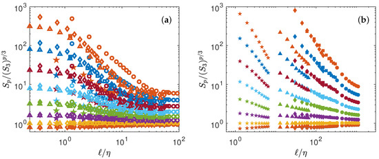 Test of K41 universality Equation (4). (a) Numerical data (b) Experimental data. The structure functions have been shifted by arbitrary factors for clarity and are coded by color: : blue symbols; : orange symbols; : yellow symbols; : magenta symbols; : green symbols; : light blue symbols; : red symbols; : blue symbols; : orange symbols. For K41 universality to hold, all the function should be constant, for a given p.