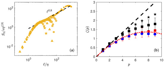 (a) Determination of by best collapse using both DNS (open symbols) and experiments (filled symbols). The black dashed line is . (b) Scaling exponents of the wavelet structure functions of as a function of the order, from Table 4, for DNS (blue circle) and experiments (red square). The red dotted line is the function with given by , with and . The black stars correspond to (see Table 4), while the black squares correspond to .