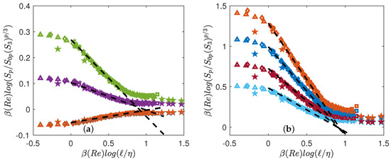 Therefore, we should be able to collapse all structure functions, at different Reynolds number by plotting as a function of , given that . There is however no clear prediction about the value of L and we show in the data analysis (Section 4) that L differs from .