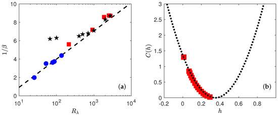 (a) Variation of versus in experiments (red square) and DNS (blue circle) when using the DNS at as the reference case. Black stars correspond to the values found by Gagne and Castaing in [7] shifted by an arbitrary factor to coincide the values at large Reynolds. The black dashed line is . (b) Multifractal spectrum for the experiments. The spectrum is obtained by taking inverse Legendre transform of the scaling exponents shown in Figure 4. The dotted line is a parabolic fit with and .