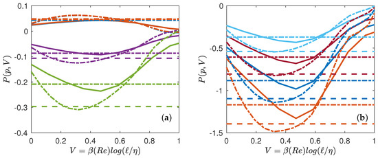 Multifractal equation of state of turbulence. Multifractal pressure as a function of the volume for (line), (dashed-dotted line). The functions are coded by color. (a) : blue symbols; : orange symbols; : magenta symbols; : green symbols; (b) : light blue symbols; : red symbols; : blue symbols; : orange symbols. The colored dotted line (resp. dashed dotted line) are values corresponding to (resp. ), that are reported in Table 4.