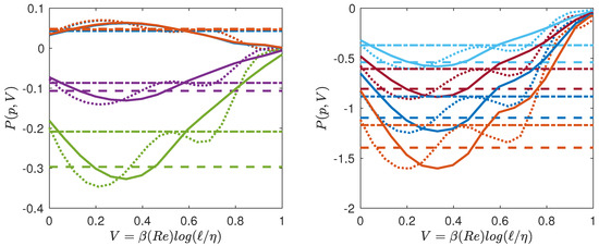 Given our free energy, , we can also compute the quantity conjugate to the volume, i.e., the multifractal pressure as: . In the inertial range, where , we thus get , which only depends on the temperature. Outside the inertial range, P has the meaning of a local scaling exponent that also depends upon the scale, i.e., on the volume V and on N (Reynolds number). Using our universal functions derived in Figure 5, we can then compute empirically the multifractal pressure P and see how it varies as a function of T, V and N. It is provided in Figure 7 for and , and in Figure 8 for and . We see that at low Reynolds number, the pressure decreases monotonically from the dissipative range, reaches a lowest points and then increases towards the largest scale. There is no clear flat plateau that would correspond to an “inertial” range. In contrast, at higher Reynolds number, a plateau appears for to when going towards the largest scale, the value of the plateau corresponding to . The plateau transforms into an inflection point for making the derivative change sign. This is reminiscent of a phase transition occurring in the inertial range, with coexistence of two phases: one “laminar” and one “turbulent”. We interpret such a phase transition as the result of the coexistence of region of flows with different Hölder exponents, with areas where the flow has been regularized due to the action of viscosity, because of the random character of the dissipative scale (see below).