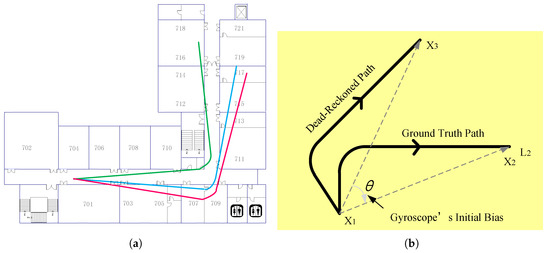 Figure 2. (a) path estimates; (b) using the landmark to correct the deviation.Landmarks can correct the deviation. As shown in Figure 2b, the position X of the user at time is known, dead reckoning with initial bias estimates that the position is X at time , and the real position is X. Assuming that the user encounters the landmark L at time and the location of L is X, which is known, the algorithm thus considers that the the location of the user is X, which is an accuracy position.