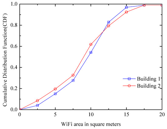 WiFi landmark: The indoor environments have many WiFi areas where all locations can receive a different set of WiFi APs, and they are in different sizes. Figure 3 shows the size distribution of WiFi AP coverage areas. If the phone can hear a group of WiFi APs in a small area, it can be considered to be in the area. The figure measures the CDF of WiFi coverage area, for example, if x is 5, y is 0.2, which means there are 20% WiFi APs, and every one of them covers an area not more than 5 m. From the figure, we can know the approximate proportion of WiFi APs that are suitable as landmarks. If the area is small, the positioning error is small. There are eight and five WiFi landmarks in small areas found on the two floors of the laboratory building, and each size is less than 4 m.