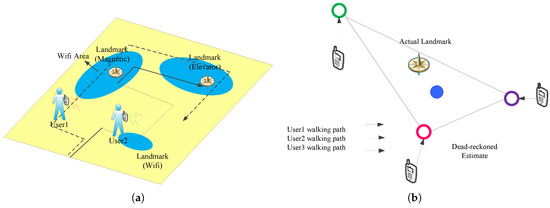 Considering that dead reckoning has random error, the paper calculates position of the landmark by combining multiple dead reckoning estimates of a landmark. Intuitively, estimation errors are random and independent due to noises on the sensor and human step size. By combining these estimations with errors, it is expected that the mean will converge to a more accurate location. Figure 4b illustrates the feasibility of this method by simple calculation of centroid, where the circle represents the center of dead reckoning estimate—each one has a large error but multiple estimates with errors yield a better estimate. In order to avoid positioning errors due to approximation landmark patterns, landmarks should be in small areas and they will be identified combining with the WiFi signal. The specific method is described in the next section.