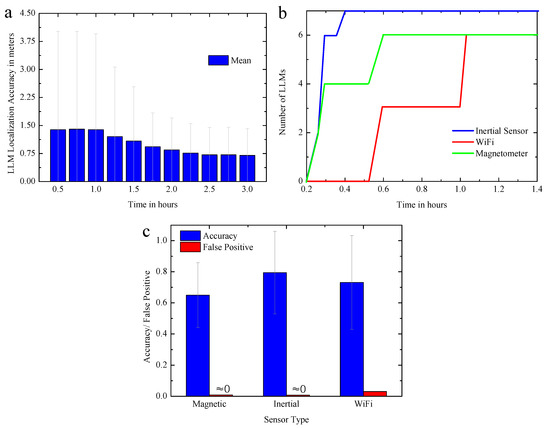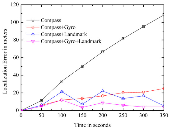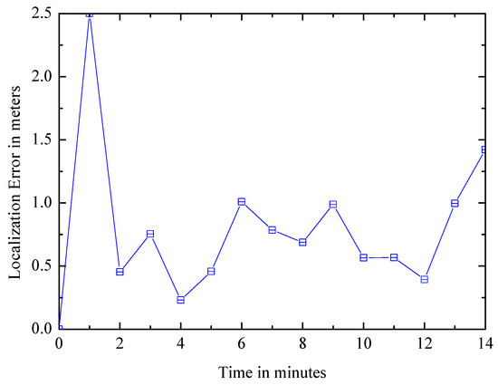 Figure 12a,b show the location accuracy of the calculated landmark and the number of the observed landmarks change over time respectively. As more users explore the environment, the number of landmarks will increase over time, and the accuracy of the landmarks will also increase as different paths lead to different independent estimates. In about 2 h, the average positional accuracy can converge to less than 1 m.