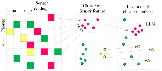 Due to the complexity and diversity of indoor signals, it is important to select an effective signal from a number of signals as a local landmark. In the paper, we choose WiFi and magnetic signal as landmarks because they are ubiquitous in indoor environments and the sensors of the mobile phone can easily obtain these signals. The tasks of finding local landmarks need to (1) distinguish different patterns from the sensed signals, and (2) test if the pattern is limited to a small area spatially. Figure 6 shows the operational flow, and the sensor data are collected by crowd sensing. The process can be shown in matrix form: the element <m,n> is sensor readings of the phone m at time n. The features of magnetic/inertial sensors include average, maximum, minimum, variance and average crossover, and they are media access control (MAC) ID and received signal strength indicator (RSSI) for WiFi.