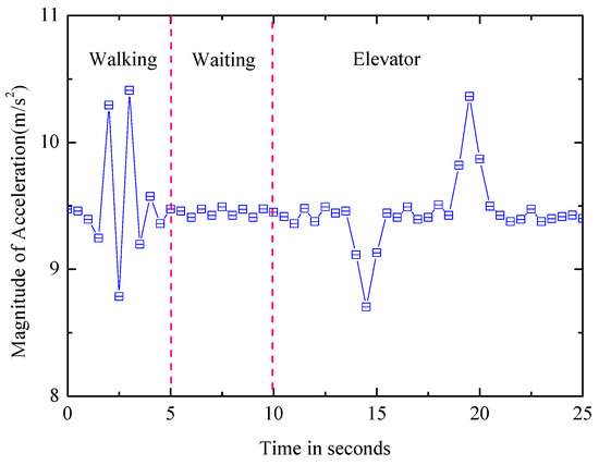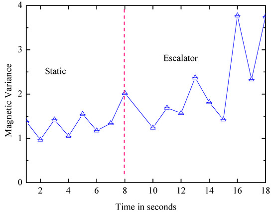 Escalator: After the elevator is identified, it is effortless to distinguish the escalator and the static from the walking and the stairs by the variance of the acceleration. The next step is to further distinguish the escalator from the static state, and the magnetic field’s variance can be used to identify them since the escalator is driven by the motor and the motor affects the surrounding magnetic field. As shown in Figure 9, the waveform of the static state is more stable.