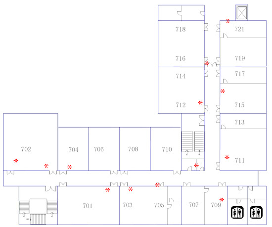 Landmark database is built in the offline phase, and each one has its coordinates in the radio map. The dataset of GLMs is easy to build because their location is known in advance. If we want to add a GLM (e.g., elevator) to the map, we only need to collect the required signal near each elevator and then mark it in the radio map according to the location of the elevator in the building. In contrast, the collection of landmark information requires a man to continuously walk in the experimental environment, sample various types of signals (such as user’s acceleration, environmental WiFi signal) at a fixed frequency, and upload them to the server to choose suitable ones as landmarks according to the above requirements.