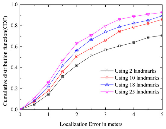 Although there are a large number of landmarks in the experimental platform, it is difficult to learn how many landmarks exist in other environments, and whether there will be a large impact on positioning if there are fewer landmarks in some buildings. Figure 13 shows the positioning errors of different numbers of landmarks, and even though there are only 10 landmarks, the average positioning error is less than 2 m. In addition, landmarks based on more dimensions (e.g., acoustic signal) can be selected if needed.