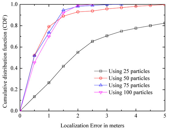 (1) Particle number: The comparison result is shown in Figure 14. It can be seen that the positioning accuracy of 50 particles is greatly improved compared with that of 25 particles; however, if the number of particles continues to increase, the positioning accuracy will not be significantly improved, and the amount of calculation will increase greatly. Therefore, the performance is saturated with about 50 particles where the median accuracy is about 0.53 m, and the number is used in subsequent experiments.