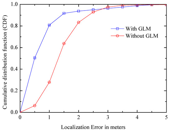 (2) Global Landmark: Figure 15 compares the CDF of positioning error with/without GLMs. In Figure 15, the average error still can be less than 1.5 m without GLMs, and in the case of using global landmarks, the performance is greatly improved, CDF within one meter increases by about two times, which is 0.8; the value is over 0.9 within 2 m, which increased by 0.1, indicating that the GLM is a successful idea.