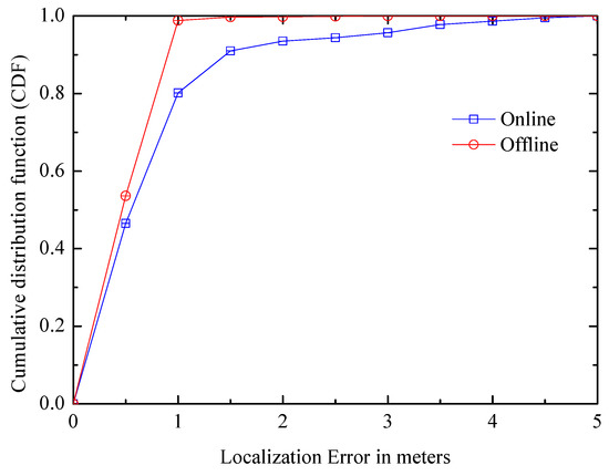 (4) Online and offline: Figure 17 shows the error distributions in two patterns. In offline patterns, the system learns its error when a user encounters a landmark, so it can track and partially correct past traces, which is not available in online mode. The figure shows that offline system can observably improve the smearing of distribution in online positioning, and the median distance error is slightly enhanced too. Moreover, although the positioning accuracy of the online mode is not as good as offline mode, its error is basically controlled within 1 m.