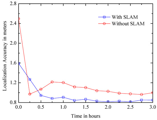 (1) Convergence time: It is the time from the beginning to the point where the positioning accuracy tends to be stable. The length of convergence time affects the positioning efficiency of the system. Figure 18 shows that the accuracy of the SLAM system converges quickly within 1 h and eventually achieves an average accuracy of approximately 0.83 m, and it is better than the non-SLAM system, which converges to an average accuracy of about 1 meter after 2 h.