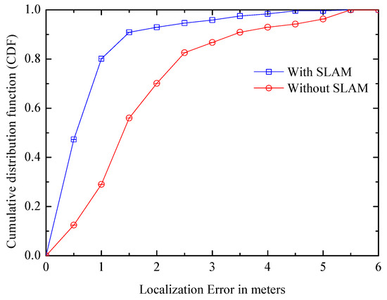 (2) Error distribution: Figure 19 compares the error distribution of the systems with/without SLAM. It can be seen that, after using the SLAM framework, the positioning accuracy is improved significantly, and the median positioning error goes down by about one meter. In the SLAM system, CDF of the positioning error within one meter is about 0.8, while it is about 0.3 in the non-SLAM system. The error of system with SLAM is basically controlled within two m, it can significantly improve the accuracy. As can been seen from Figure 18 and Figure 19, the SLAM system can obtain a high positioning accuracy in a short period of time.