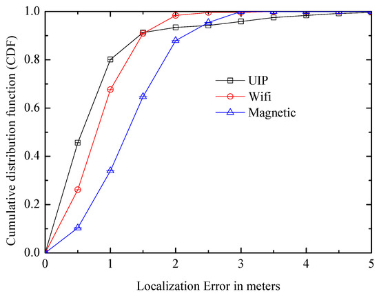 The UIP system is compared with two classical systems: the WiFi fingerprint identification system [32] and the magnetic fingerprint recognition system [33]. Figure 20 shows that the UIP has a smaller median positioning error which is about 0.5 m, while it is about 0.7 m in the WiFi system and it exceeds one meter in the magnetic system. In addition, CDF of the localization error in UIP exceeds 0.8 within one meter and 0.9 within 1.5 m, which has an obvious advantage over other systems. However, they have better worst-case errors due to the initial manual calibration, and the distribution has a shorter tail.