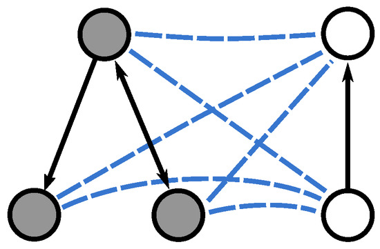 The kernel described in the previous subsection can only be computed for undirected graphs. In order to cope with directed graphs, we propose using the directed graph Laplacian introduced by Chung [26]. We first merge the two directed input graphs and as done in the undirected case, i.e., we create a complete set of undirected edges connecting the nodes of to the nodes of . Note, however, that the resulting merge graph is directed, as a consequence of the edges in and being directed (see Figure 2). Hence we define the starting states and similarly to Equation (10), but using the out degree instead: