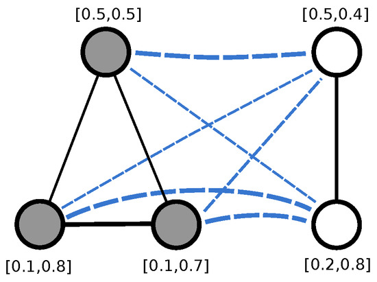 Figure 3 shows an example of two graphs with 2-dimensional signatures and their merged graph. For ease of presentation, the weight of each edge is shown by varying its thickness, i.e., the thicker the edge the higher the weight and the more similar the signatures of the connected nodes. Here we decided to compute the similarity between each pair of nodes in , effectively turning and into two weighted cliques, i.e., complete weighted graphs, where the weights on the edges encode the pairwise nodes similarity. While at first sight it may seem like we are discarding the original structure of and , note that this is actually encoded in the node signatures and thus the edge weights. In Section 4 we run an extensive set of experiments to determine if integrating node-level structural information improves the ability of the kernel to distinguish between structurally similar graphs.