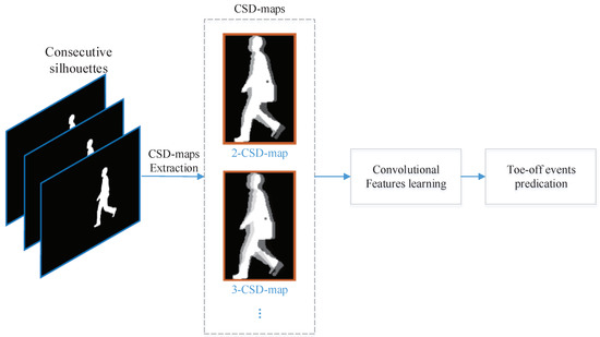 In this section, we present the technique detail of the toe-off events detection method. The framework of the proposed method is graphically presented in Figure 2. Several consecutive silhouettes of a pedestrian are first combined to generate a consecutive silhouettes difference map. Convolutional neural networks are then employed to learn the features for toe-off events classification.