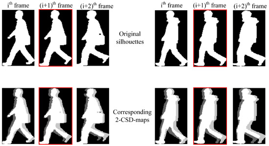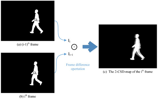 The main idea of 2-CSD-maps is graphically presented in Figure 3. The 2-CSD-map of the frame is generated from two consecutive silhouette frames. Let present the 2-CSD-map of the frame, and present the binary silhouette images of the and frame. For any pixel in , it’s pixel value can be formulated as following: