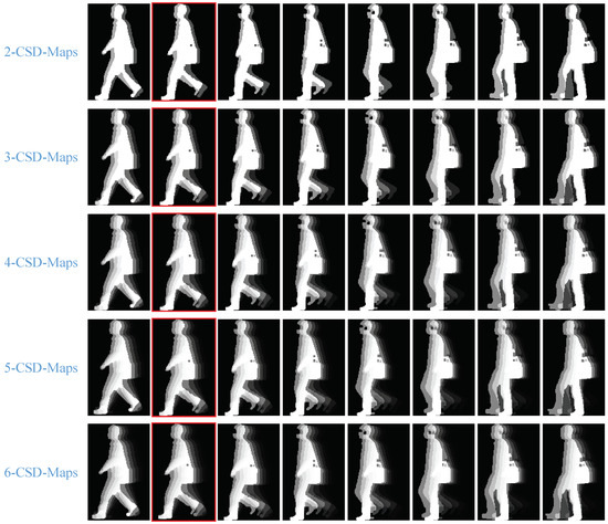 Suppose that there are n consecutive silhouettes images , , ..., and . The n-CSD-maps can be formulated as following:
