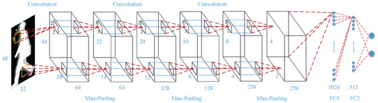 The aim of this study is not to propose another CNN but use a classic CNN to address the problem of toe-off events detection. In this paper, we employ the CNN architecture presented in Figure 6. It is modified from DeepID [32]. The network includes three convolutional layers and three fully connected layers. The three convolutional layers have 64, 128 and 256 kernels and their sizes are respectively 5 × 5, 3 × 3 × 64 and 3 × 3 × 128. The first fully connected layer has 1024 neurons and the second fully connected layer has 512 neurons. In the last fully connected layer, there are two neurons, one for toe-off frame output and the other for non-toe-off frame output. The max-pooling with a size of 2 and a stride of 2 follows the three convolutional layers.