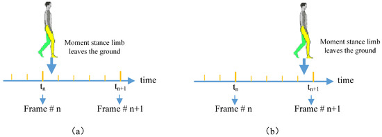 Human gait is a continuous and periodic movement. In medical field, the toe-off event is defined as the moment that the stance limb leaves the ground, shown as in Figure 1. While, the video data is the sampling record of human gait with a certain frame rate . Usually, the frame rate would be 30 fps. And the gait cycle of a person is averagely about 1 s time consuming. This means that one gait movement cycle of a person would be recoded as about 30 consecutive frames with an interval of 33 ms. The problem is that the moment the stance limb leaving the ground may not be included in the 30 consecutive sampling frames. In this paper, the first frame after the stance limb leaves the ground is defined as a toe-off frame. For example, as shown in Figure 7, if the moment that the stance limb leaves the ground falls within the period of , then the frame (n + 1) is defined as the toe-off frame.