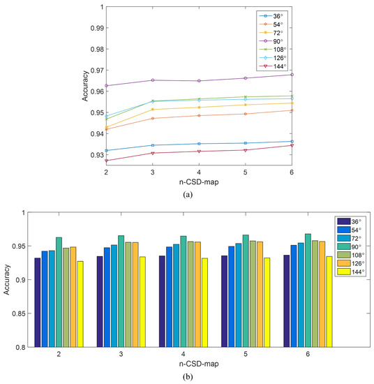 Figure 9. The relationship between detection accuracy of the proposed method and n-CSD-map. (a) The detection accuracy as a function of n-CSD-map. (b) The bars of the detection accuracy VS. n-CSD-map. - Configuration of Training set and test set. The samples from subject #001 to subject #90 of each viewing angle are selected for model training. The rest of samples (from subject #091 to subject #124) is used for testing.