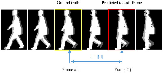 In this paper, a new evaluation indicator, namely n-frame-error cumulative detection accuracy, is designed to evaluate the performance of the proposed method besides detection accuracy and ROC curve. The n-frame-error cumulative detection accuracy is similar with cumulative match characteristics (CMC) curves [35]. Let’s d represents the difference between the sequence number of predicted toe-off frame and the ground truth, shown as Figure 10. n-frame-error cumulative detection accuracy indicates the detection accuracy with the condition of .
