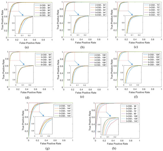 The ROC curves of the proposed method. (a) The ROC curves under the viewing angle of 36. (b) The ROC curves under the viewing angle of 54. (c) The ROC curves under the viewing angle of 72. (d) The ROC curves under the viewing angle of 90. (e) The ROC curves under the viewing angle of 108. (f) The ROC curves under the viewing angle of 126. (g) The ROC curves under the viewing angle of 144. (h) The ROC curves of the proposed method with 3-CSD-map under different viewing angles of 36, 54, 72, 90, 108, 126 and 144.