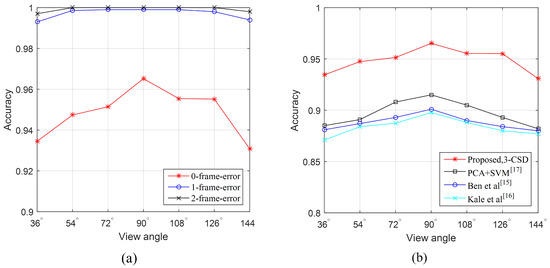 Figure 12b shows the detection accuracy of the proposed method as a function of viewing angles compared with [24,25,36]. Due to the reason that [24,25] do not provide toe-off event detection results directly, we implemented the both algorithms for toe-off event detection according to the main ideas of [24,25]. Ref. [36] is our previous work based on principal component analysis and support vector machine. In this experiment, all frames are used for training and testing in 5-fold cross validation. We can see that our CNN-based method significantly outperforms Ben’s method [24], Kale’s method [25] and our previous work [36] in the viewing angles of 36, 54, 72, 90, 108, 126, and 144.