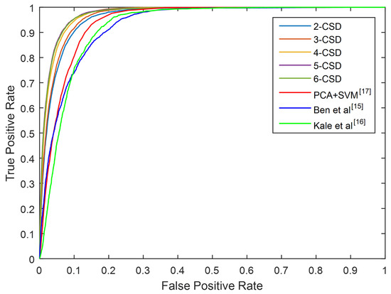 In Figure 13, we use a confusion matrix to evaluate cross viewing angle detection accuracy of this method using 3-CSD-maps. As can be seen in the figure, this method achieves the best accuracy in the counter-diagonal and around 90% in the other areas, which means that this method can get good accuracy for cross view toe-off detection. Figure 14 presents the ROC curves of this method under all viewing angles compared with [24,25,36]. We can see that the proposed method significantly outperforms the comparation methods.