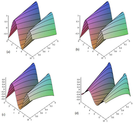Figure 4 consists of two graphs; (a) the exact solution of and (b) the LADM solution of Example 4 at . Figure 4a,b indicate that the present method has strong agreement with exact solution for the problem. In Figure 4c,d, two graphs (c) and (d) are given, that represent the analytical solution of Example 4 at fractional and respectively. Figure 4c,d reflects that, as fractional order approaches to integer order, the solution surfaces of fractional order are convergent to the integer order surface. It means that physically we can model, any of the surfaces as desired by the physical phenomena occurring in nature.