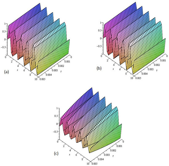 Figure 3 consists of three graphs; (a) the exact solution of and (b) LADM solution of Example 3 at . Figure 3a,b indicate that the present method has strong agreement with exact solution for the problem. In Figure 3c, graphs (c) are given, that represent the analytical solution of Example 3 at fractional respectively. Figure 3c reflects that the fractional order approaches to integer order, the solution surfaces of fractional order are convergent to the integer order surface. It means that physically we can model, any of the surfaces as desired by the physical phenomena occurring in nature.