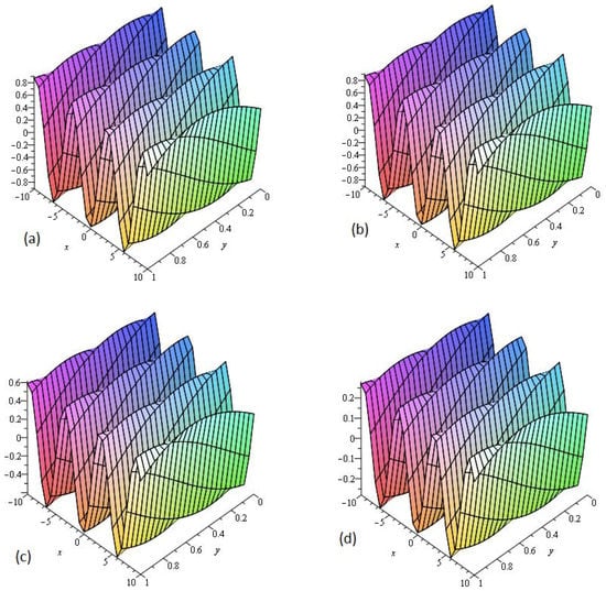 Figure 2 consists of four graphs; (a) the exact solution of and (b) LADM solution of Example 2 at . Figure 2a,b indicate that the present method has strong agreement with exact solution for the problem. In Figure 2c,d, two graphs (c) and (d) are given, that represents the analytical solution of Example 2 at fractional and respectively. Figure 2c,d reflects that as fractional order approaches to integer order the solution surfaces of fractional order are convergent to the integer order surface. It means that physically we can model any of the surfaces as desired by the physical phenomena occurring in nature.