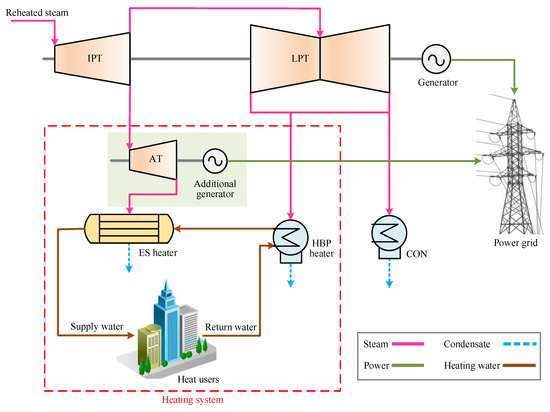 To reduce the exergy destruction in the supply water heating process, a novel HBP heating design with energy cascade utilization has been brought forward, as shown in Figure 2. The extracted heating steam is first exploited to drive the additional turbine (AT) and additional generator for generating electricity. Afterwards, the steam pressure will fall from 0.3–0.5 MPa to about 0.1 MPa or lower, guaranteeing that the upper-terminal temperature difference of the ES heater is above 10 °C, namely, maintaining the steam saturation temperature 10 °C larger than the outlet supply water temperature. The electricity exported from the additional generator can be used as auxiliary power on site, or transmitted to power consumers through the power grid. By converting the excess steam pressure into electricity, the exergy destruction caused by the pressure disuse can be diminished, which implies that the new configuration takes advantage of the steam energy more sufficiently and conduces to the advancement of the cogeneration unit. The proposed concept was applied in the reference unit and its thermo-economic performance and sensitivity were comparatively explored.