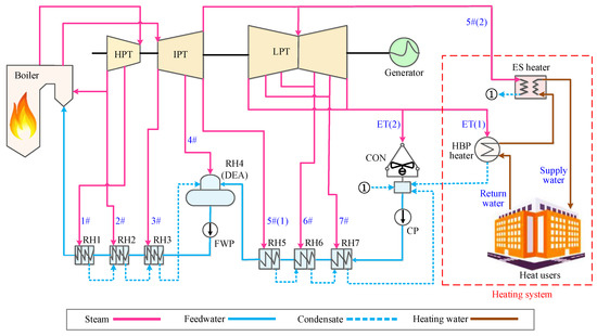 The reference case is a subcritical coal-fired cogeneration unit cooperating an HBP heating system, located in the north of China. As Figure 3 depicts, the steam turbine consists of a high-pressure turbine (HPT), an IPT and two LPTs associated with an air-cooling condenser (CON). There are three high-pressure regenerative heaters (RH), one deaerator (DEA) and three low-pressure RHs installed in the feedwater cycle. The data of the reference HBP–CHP unit under the rated heating condition are displayed in Table 1 and Table 2. The heating service of this unit lasts from 15 November to 15 March of the next year, and the space-heating demand of 6.52 million square meters in a rural area can be satisfied. During the heating season, the back pressure of the LPT increases from 14 kPa to 34 kPa and the HBP heater is adopted to heat the supply water of the primary loop. Then, the supply water flows into the ES heater and gains energy from the stage 5# extraction steam. While the back pressure is 34 kPa, the supply water can be heated up to 70 °C by the HBP heater using the exhaust steam of about 72 °C. On the condition that the weather is relatively warm and the required supply water temperature is below 70 °C, the ES heater does not work. If necessary, the supply water can be heated up to 80–100 °C by the ES heater. Under the rated heating condition, the theoretical lowest steam pressure for sufficiently heating in the ES heater is approximately 0.09 MPa (when the supply water temperature is 86 °C and the upper-terminal temperature difference of the heater is regarded as 10 °C for efficient heat exchange, the saturation pressure is about 0.09 MPa, corresponding to the saturation temperature of 96 °C), which implies that the actual extraction steam pressure of 0.39 MPa is much higher than the requisite value, leading to a high-temperature difference and much exergy destruction in the actual heat exchange process. It is essential to make the most of the excess steam pressure and minimize the exergy loss.