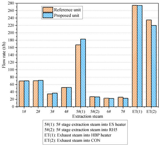The overall performances of the proposed HBP–CHP unit and the reference are presented in Table 5. The steam pressure into the ES heater dwindles from 0.39 to 0.09 MPa after the retrofitting, and the excess pressure of the extracted heating steam is converted into electricity, which contributes to an additional net power output of 8.4 MW for the CHP system. In consequence, the energy utilization factor and artificial thermal efficiency are promoted by 1.08 and 2.01 percentage points, respectively. Aside from this, the specific enthalpy of the extracted heating steam does not decline much through the AT in the reformative scheme, implying that most of the energy of the extraction steam still releases into the ES heater. Table 5 and Figure 4 indicate that, in contrast to the reference unit, more extraction steam (5#(1)) from the IPT is tapped in the modified one, which can expand in the AT to generate electricity, and the steam conveyed into the LTP is reduced accordingly. Therefore, less exhaust steam gets into the CON, and energy loss to the ambient is cut down, while the recovery efficiency of the exhaust steam is raised from 53.90% to 55.49%. Above all, the new design can not only employ the waste pressure of the extracted heating steam, but also diminish the energy loss of the exhaust steam. These findings confirm that the reformative heating configuration is capable of remarkably boosting the performance of the cogeneration unit, and plenty of economic benefits may be expected.