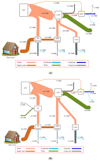 Figure 5 illustrates the energy flows that take place in the two HBP heating systems. The heat absorbed by the supply water in the HBP heater and the ES heater remains unchanged after the retrofitting. However, more energy is obtained from the IPT along with the extraction steam for heating in the reformative configuration, and 10.6 MW energy of the extraction steam is converted into work through the AT. At the same time, the waste heat released from the CON is reduced by 9.0 MW as a result of the new design, contributing to a decrease in the total energy loss of the unit, and furthermore, the work output of the LPT declines by 4.4 MW, because less steam gets access to the LPT from the IPT in the modified scheme.