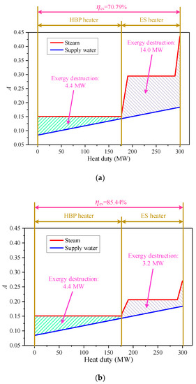 For the purpose of exploring the inherent exergy change during the supply water heating, the energy utilization diagram (EUD) analysis was carried out on the heating process, as displayed in Figure 7, and the energy level A was calculated as Equation (7) [39,40]. It is obvious that the exergy destruction in the ES heater drops dramatically, because the steam saturation temperature decreases from 142.7 °C to 96.7 °C due to the new design, and A remarkably dwindles accordingly. As a consequence, the exergy efficiency of the supply water heating process is improved from 70.79% to 85.44%, which is beneficial to the advancement of the cogeneration unit.