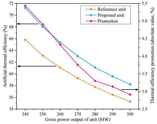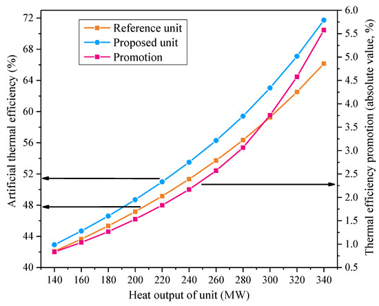 Figure 8 illustrates the impact of the unit power output on the thermal efficiency promotion caused by the proposed concept. When the cogeneration unit generates less electricity under the heat output of 300.0 MW, the optimized design contributes to a larger increment in the artificial thermal efficiency; thereby, more fuel is conserved. As the unit power output rises, the ratio of the extracted heating steam to the main steam falls and the effective impact of the modified configuration recedes. In the north of China, the generation capacities of cogeneration units may be severely restricted at low levels in winter, to leave more room for renewable power (for example, wind power, solar power and so on); nevertheless, the heating demand is huge [41]. Furthermore, the total installed power capacity is also superfluous in these regions, facing an oversupply potential of electricity [42]. It seems that these cogeneration units usually operate at low-power outputs, but during the heating season they operate at high-heat outputs. Therefore, the new design can play a more significant role in the energy conservation of the cogeneration units located in northern China.