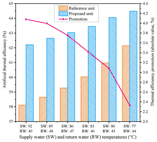When the demand of the heating service changes, the supply water and return water temperatures of the primary loop vary at the same time, according to the actual district heating condition, and are positively related to each other. To explore how the new design enhances the unit performance under different supply water and return water temperatures, several representative supply water and return water temperatures were selected for comparative study based on the actual operation data of the reference unit during the heating season, and the results are depicted in Figure 10. With the decreases of the supply water and return water temperatures, the artificial thermal efficiencies of the two units grow, but the thermal efficiency promotion diminishes. These results can be explained by noting that when the supply water and return water temperatures are relatively high, more extraction steam from the IPT is employed for heating the supply water, resulting in the AT generating more work, which improves unit efficiency.