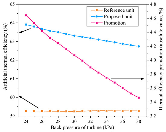 Figure 11 shows how turbine back pressure affects the artificial thermal efficiency of the cogeneration unit with or without the reformative design. These data imply that when the back pressure gets bigger, the artificial thermal efficiency of the reference unit remains almost unchanged, but the artificial thermal efficiency of the modified one drops and the efficiency promotion also declines. This is because the HBP heater can heat the supply water up to a higher temperature under a larger back pressure, leading to less heat being absorbed by the supply water in the ES heater, and therefore less steam being extracted from the IPT. This process reduces the work output of the AT and weakens the energy-saving effect of the proposed concept.