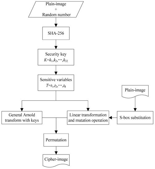 The proposed cryptosystem includes two stages. In the first stage, keystreams are produced by the key generator based on SHA-256 hash with the input of the plain-image added a random sequence. In the second stage, the permutation and gray-level encryption structure is built by discrete Arnold map combined with S-box substitution, linear transformation and mutation operation. The architecture of the proposed cryptosystem is shown in Figure 1.