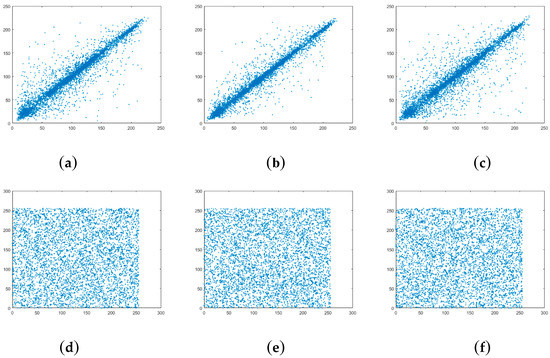Correlation of two adjacent pixels in the plain-image of 256 × 256 Lena: (a) horizontal direction; (b) vertical direction; (c) diagonal direction. Correlation of two adjacent pixels in the cipher-image of 256 × 256 Lena: (d) horizontal direction; (e) vertical direction; (f) diagonal direction.