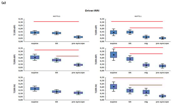 - in supine position (phase I): TE was greater than 0 in both groups for all driver-target pairs. The highest values of TE were noted for RRI-dBP and RRI-SV (Figure 3a) and lightly lower TE was observed for the RRI-SV link.